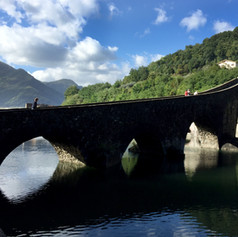 An unexpected delight was stopping for lunch at a former hunting lodge warmed by a large fireplace. The walls were decorated with game trophies and photographs of celebrities. The roadways were mostly smooth but when we crossed over the mountains into the province of Mass and Carrara we had a few harrowing experiences. One horrifying moment was when we entered a dark long tunnel. The only illumination in that cavernous space were our own headlights. Suddenly our bikes started plunging into gaping potholes, jarring our bodies. I held on but kept the speed and hoped the long, dank tunnel would end. Another challenging spot came when we decided to stop for lunch in a village with honey-colored stone walls. We made our way up to the hilltop town via a very steep and slender rock alleyway barely 4ft wide. It was crazy riding in this tight space full of well-worn, slippery cobblestones.